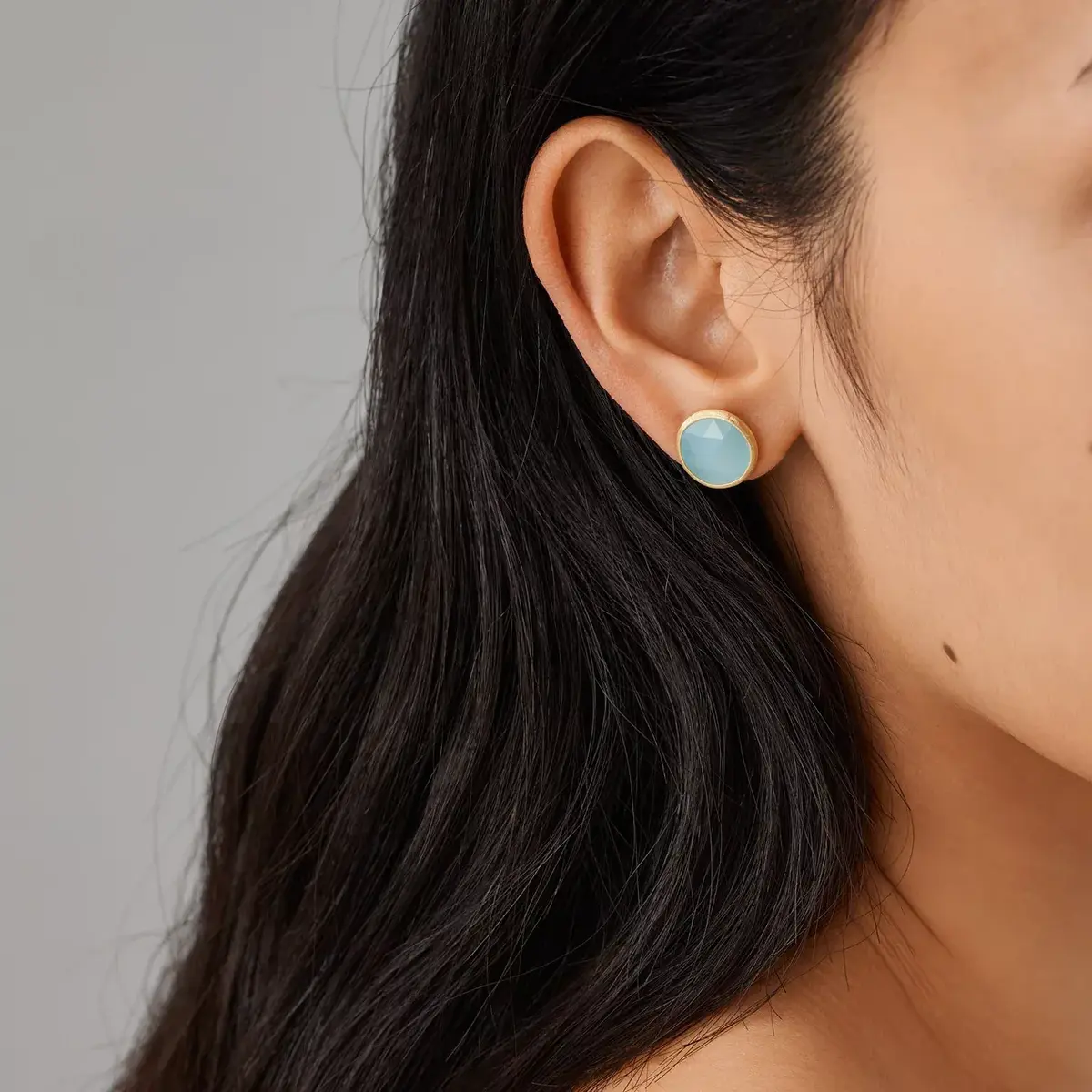 Pop-colored and minimalist, these rose-cut semi-precious gemstone stud earrings are embellished by an 18K yellow gold bezel set Aquamarine, finely hand-engraved using the ancient Florentine technique. Part of the Jaipur Collection by Marco Bicego, made in Italy. Diameter: 0.5 inches.