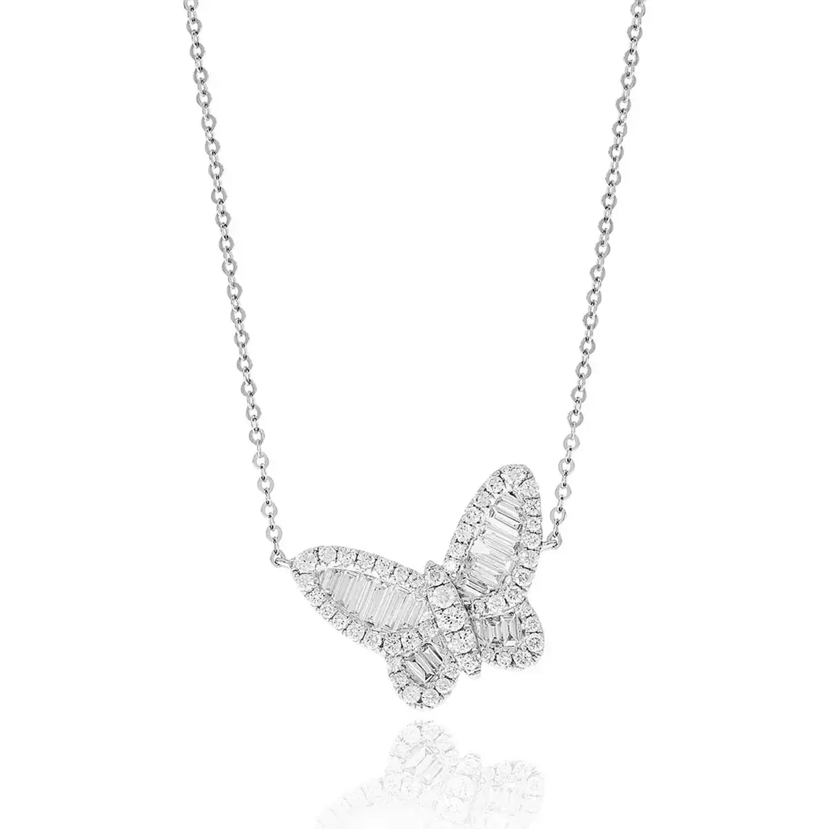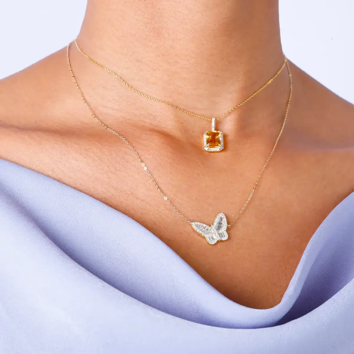 NecklaceElevate your style with the elegant Baguette Diamond Butterfly Necklace, a fine jewelry piece that exudes charm and grace. Designed with meticulous attention to detail, this necklace features a delicate butterfly-shaped pendant made of 14k gold, adorned with sparkling baguette diamonds that capture the light most exquisitely. Whether worn as a standalone piece or layered with other fine jewelry, this necklace is a symbol of refined taste and luxury.
