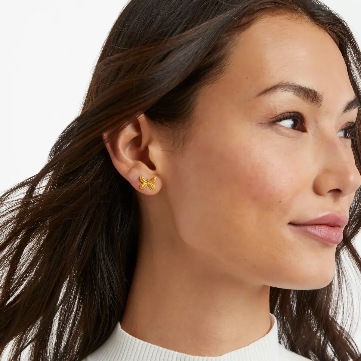 Dainty golden butterfly studs. Product Details: 24K gold plate. 0.75 inch length.