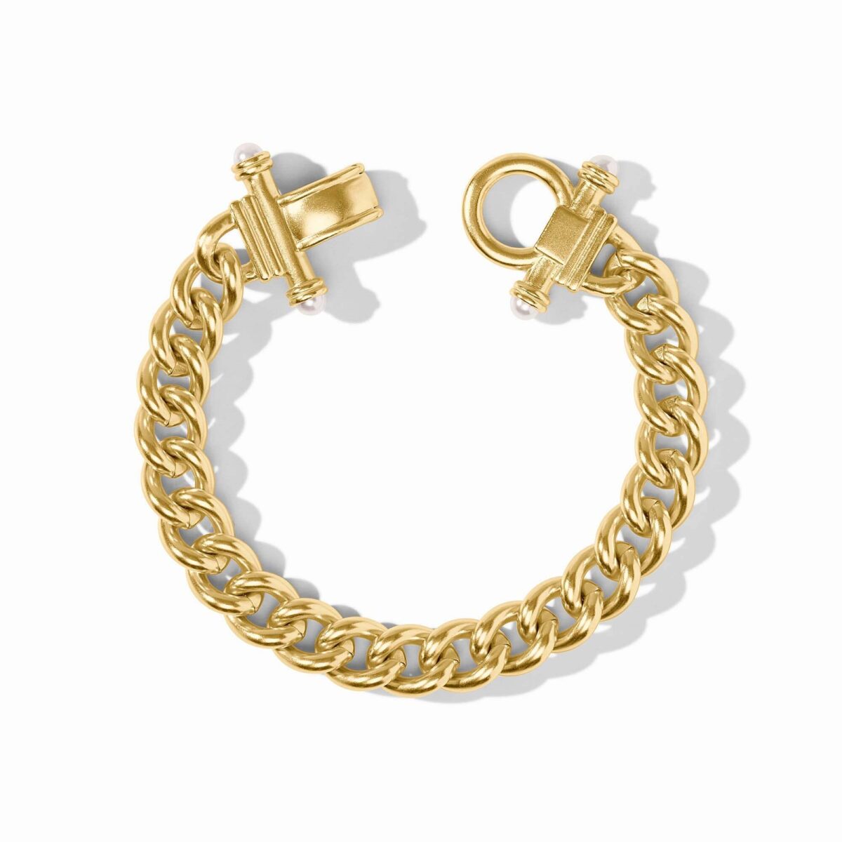 Classic chain bracelet with extra detailed clasp for unique twist. Product Details: 24K gold plate, glass pearl. Length: 7.5 inches (regular). Width: 0.4 inches. Closes with fold over clasp.