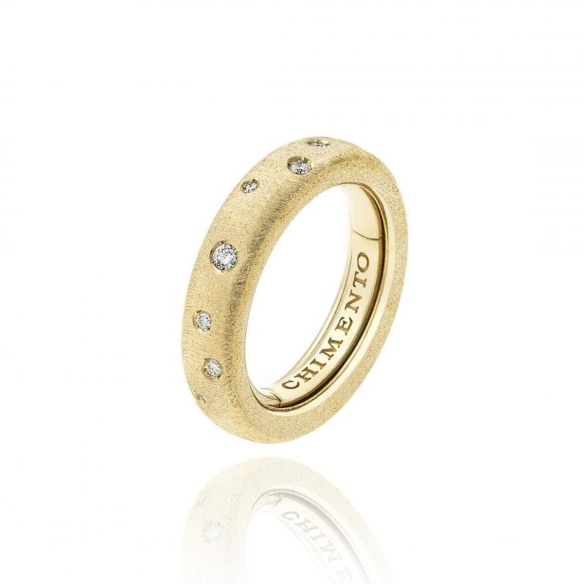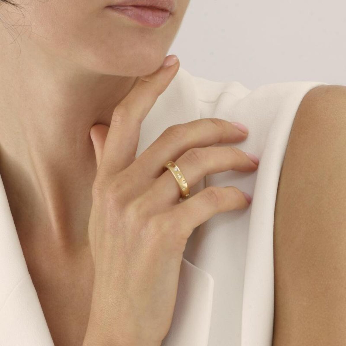Multi-size ring in 18 kt yellow gold and 0.24 ct white diamonds. Satin finishing. With patented Size-Fit mechanism. Band height: 5 mm.