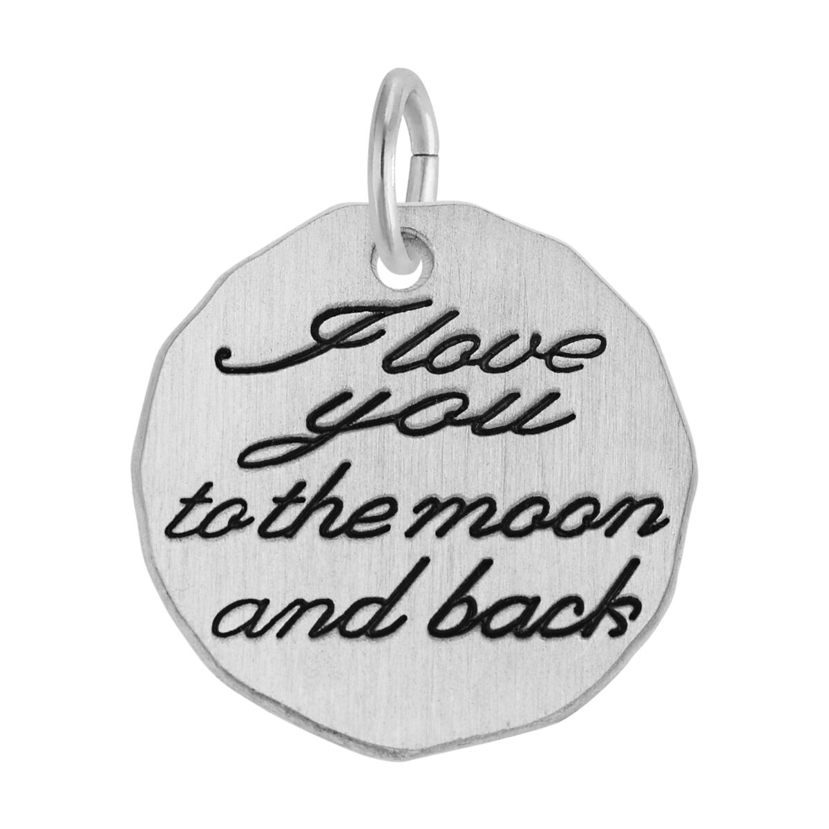 I Love You to the Moon and Back Tag Charm: A timeless, elegant gift for expressing love. Dimensions : 0.73 in x 0.73 in (18.75 mm x 18.75 mm). Metal: Rhodium Plated Sterling Silver. Also available in White Gold & Yellow Gold. Please inquire for pricing.