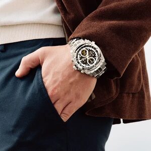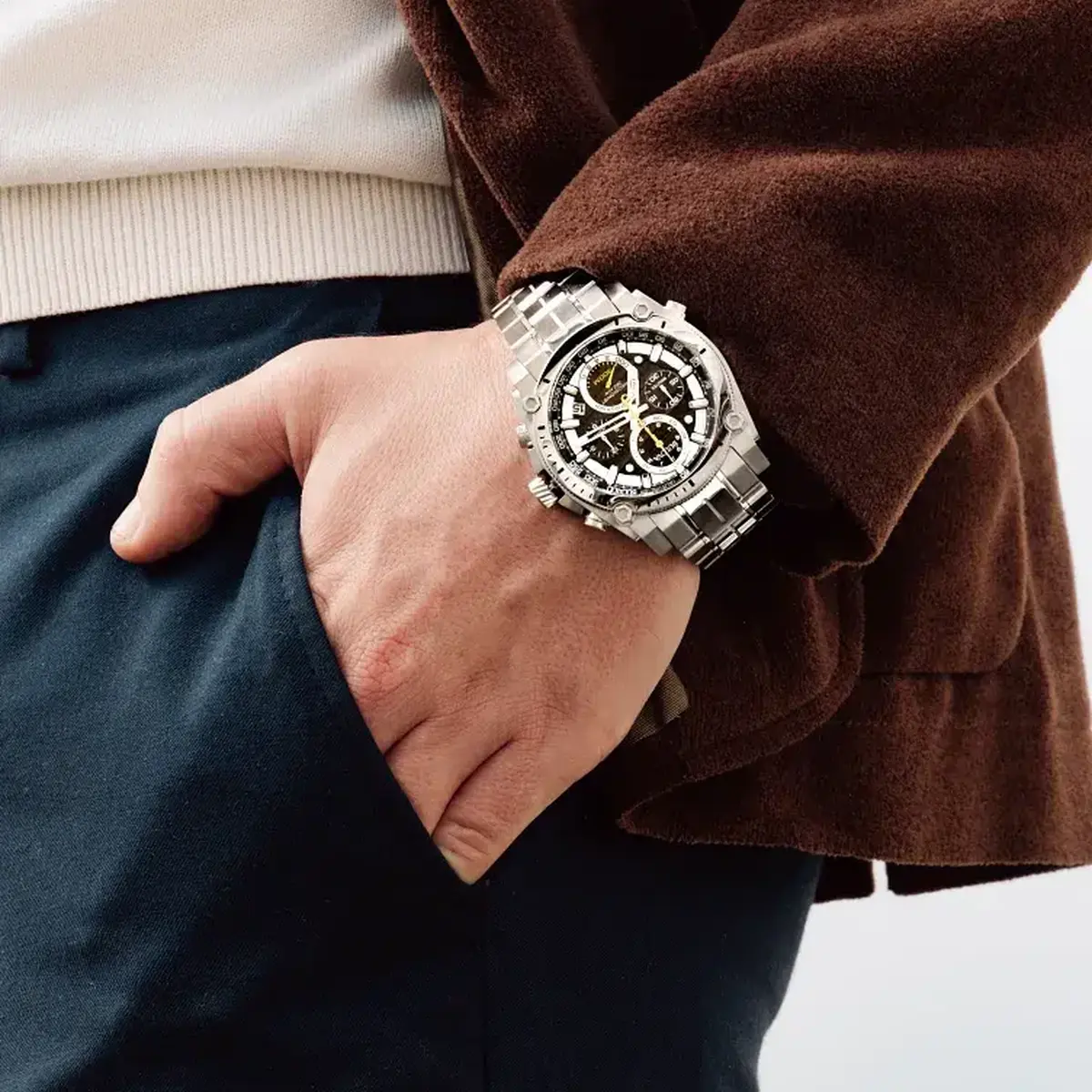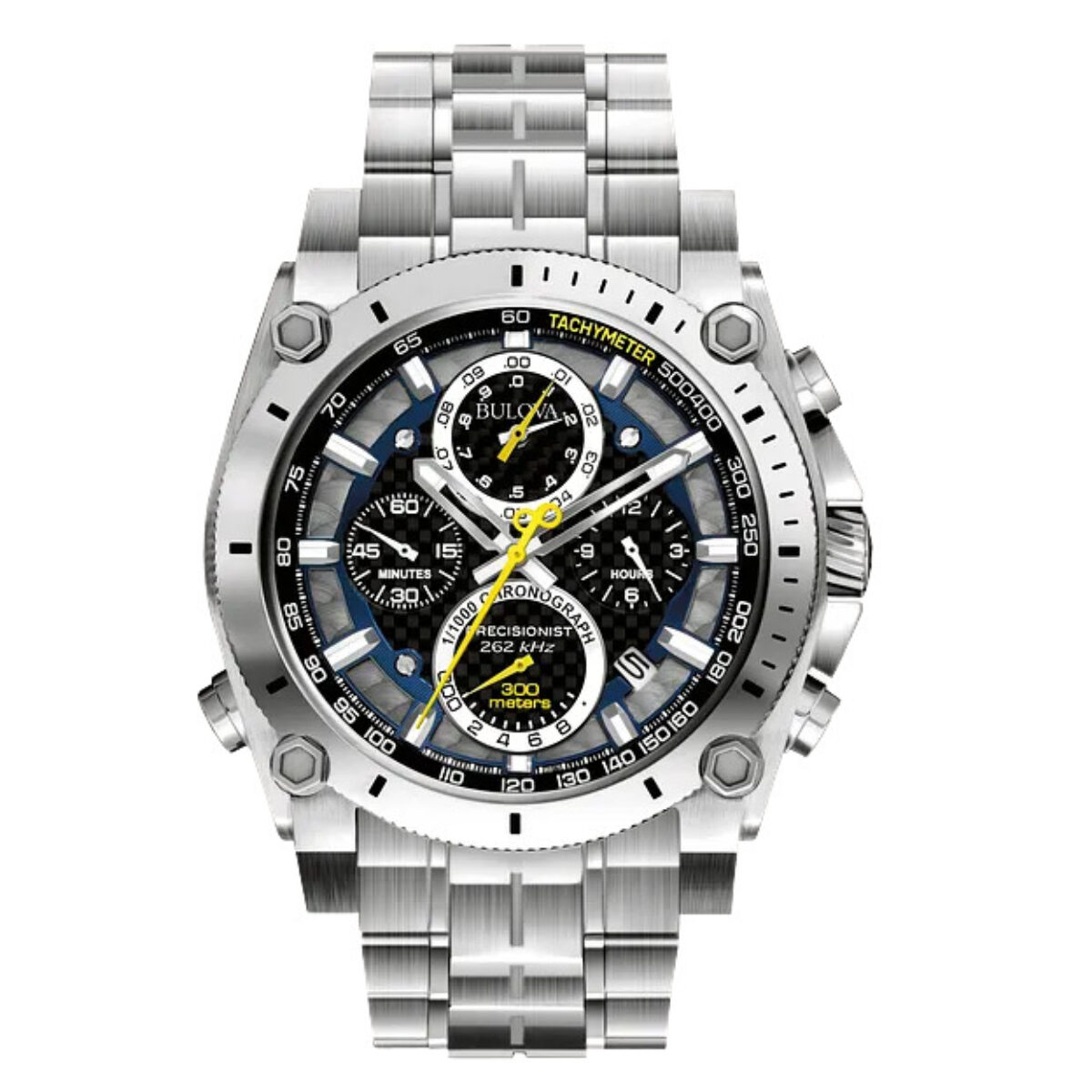From the Icon Collection with precise timing to 1/1000th of a second and continuous-sweep second hand, the chronograph is particularly refined. In stainless steel with curved crystal, multiple-layer black carbon fiber, blue, silver and black dial, yellow second hand, luminous hour and minute hands, luminous markers, calendar, screw-back case, screw-down crown, and secure double-press fold-over clasp with safety lock. Powered by Bulovas proprietary three-prong quartz crystal Precisionist movement with a 262kHz vibrational frequency--eight times greater than standard quartz watches--for unparalleled accuracy.