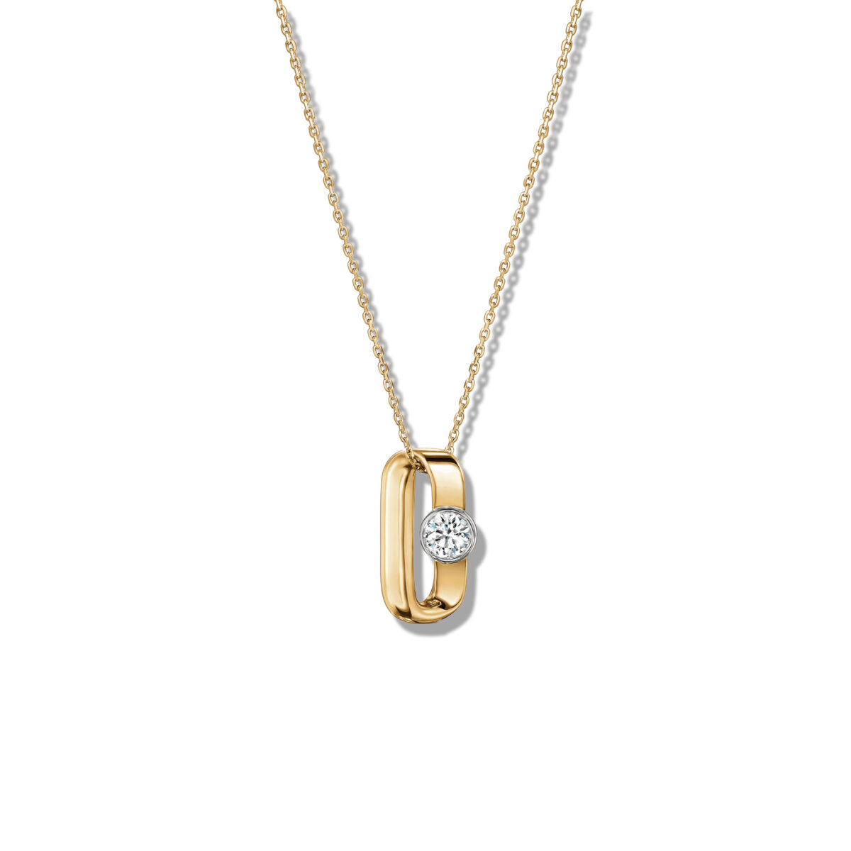 The INSIDE/OUT Single Diamond Pendant Necklace is designed for the woman who appreciates the details. Its combination of contrasting metals, dimensional design, and the simple elegance of the "link" silhouette makes it an appealing accessory for anyone looking to express their personal style.