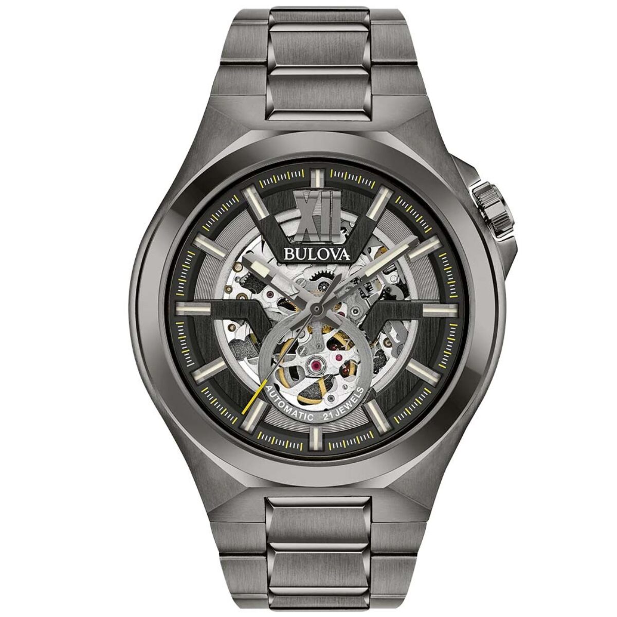 From the Classic Automatic Collection. New Sport style in gunmetal IP stainless steel case, open aperture black dial with silver-tone accents and black inner dial ring, exhibition case back, skeleton automatic movement with 40-hour power reserve, sapphire glass, gunmetal IP stainless steel bracelet with double-press deployment closure, and water resistance to 100 meters.