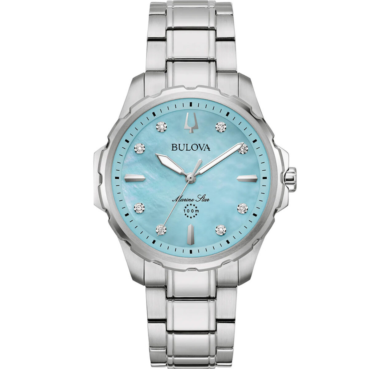 rom the legendary Bulova Marine Star collection, this elegant ladies’ timepiece offers unrivaled style. The silver-tone stainless steel case features a modern design with a bold crenellated fixed bezel and symmetrical case flanks. A flat sapphire crystal and protected crown provide modern reliability which is furthered by 100m of water resistance. The lustrous blue mother-of-pearl dial adds a splash of color to the timepiece, with eight diamond hour markers and a refined handset with luminescent fill for superb legibility in all conditions. The watch is paired with a dual-finished silver-tone quick-release stainless steel bracelet with a push-button deployant closure that provides both comfort and security. For timeless elegance no matter the occasion, this Bulova ladies’ timepiece makes the perfect companion.
