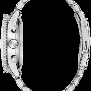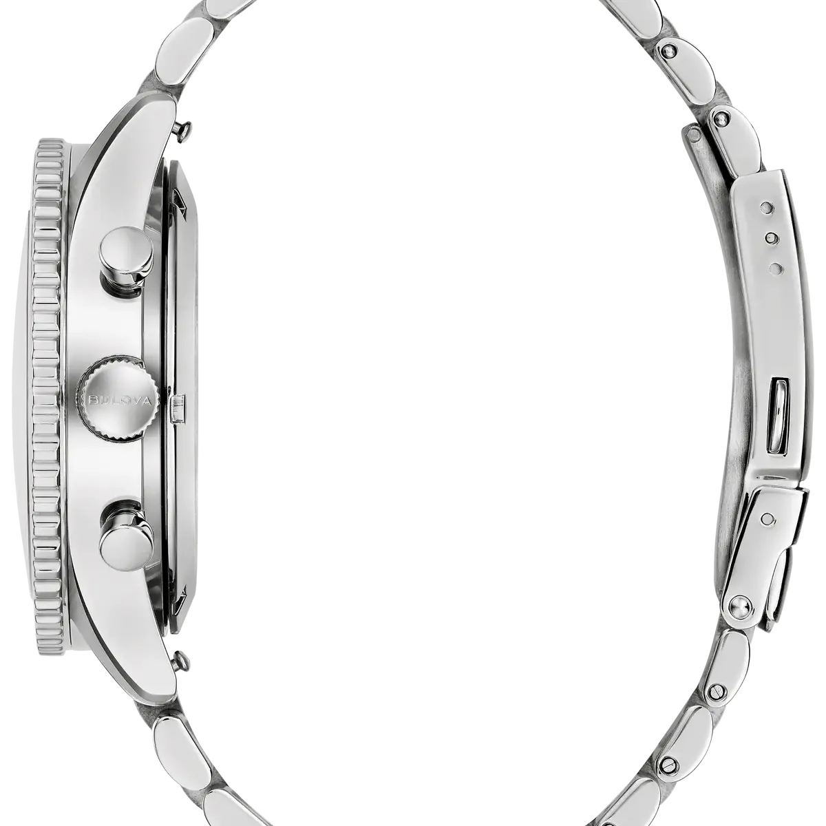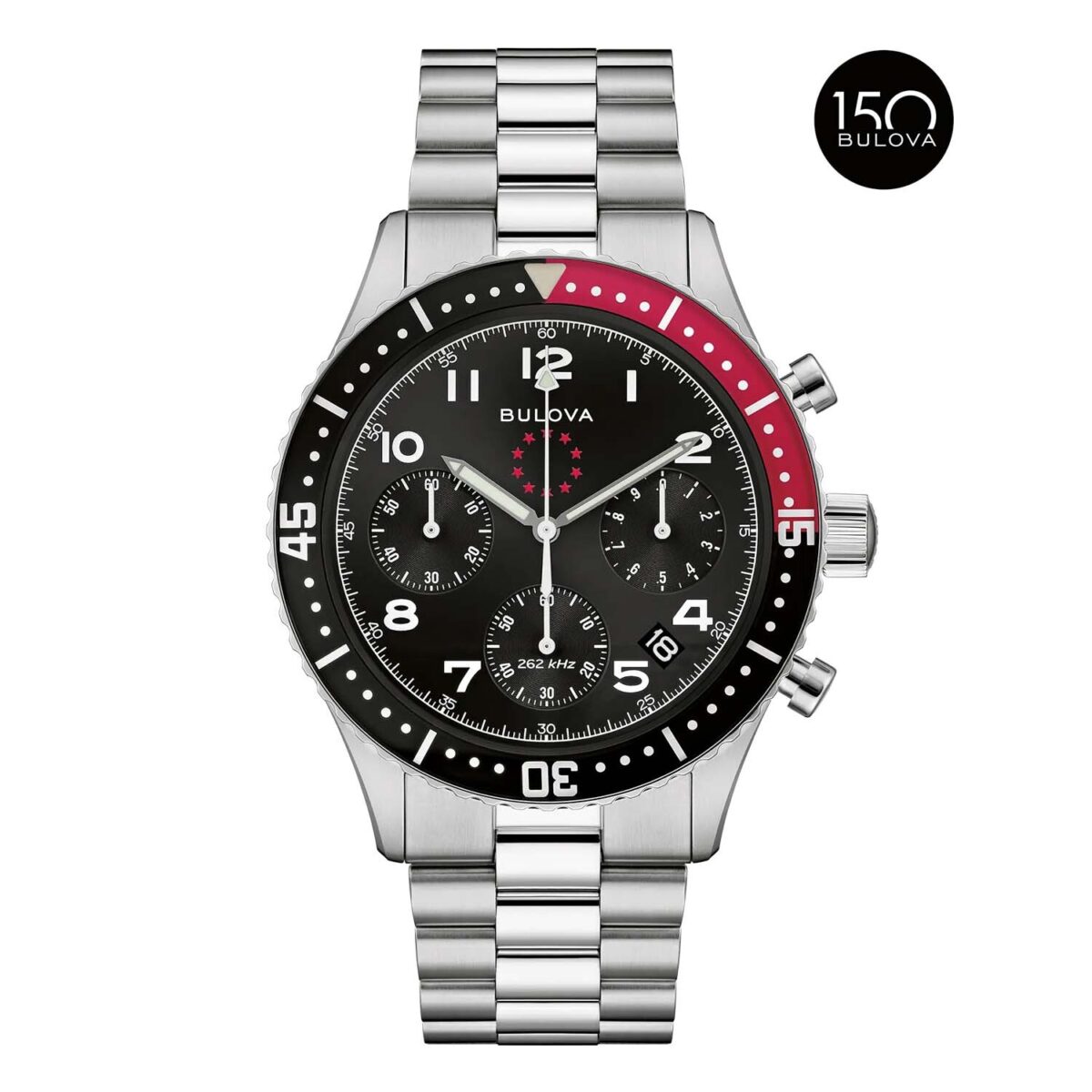 Inspired by the coveted Bulova’s Marine Star circa 1970s, this Special Edition Marine Star 6-hand chronograph celebrates one of Bulova’s most iconic collections for its 150th Anniversary. The silver-tone stainless steel case has a design that balances form and function with a striking ratcheting timing bezel, a commemorative case back featuring an original anchor design, and a profile-cut link bracelet with a push-button foldover closure. The black dial showcases the vintage Marine Star logo, silver-tone hands, and white numerals with super luminous fill, a date display, and sub-dials, including registers allowing timing to 1/20 of a second and finished with a double domed sapphire crystal. This collector’s watch is powered by our proprietary Precisionist movement, resonating at a frequency of 262khz for unparalleled accuracy, and boasts 200m water resistance with a screw-down crown. Delivered in premium packaging complete with a storybook, this Bulova men’s timepiece blends classic maritime charm with modern craftsmanship and a rich history.