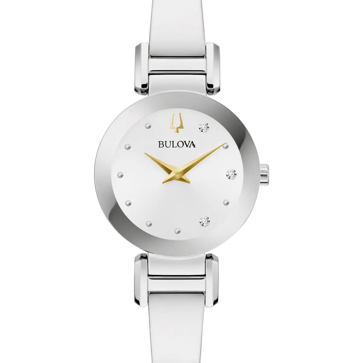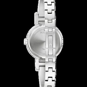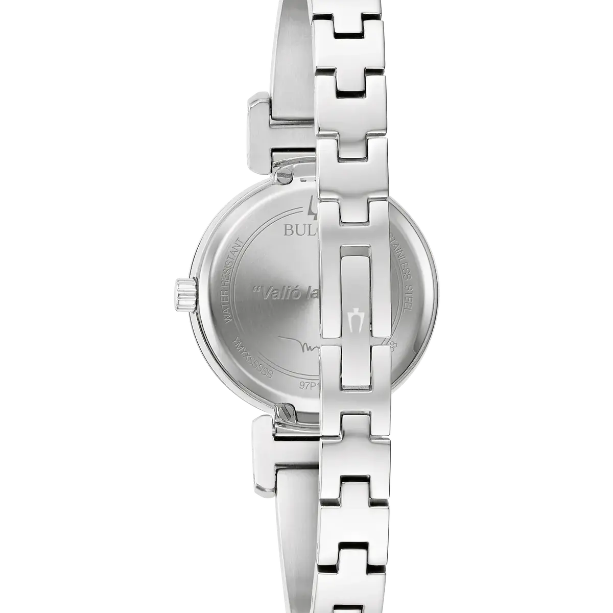 Bring the romance of Marc Anthony’s music to the wrist in this essential accessory that unites Bulova’s fine watchmaking and Marc Anthony’s iconic music in an exclusive collaboration. The new Bulova Marc Anthony Modern Bangle ladies’ watch highlights Bulova’s timeless design with a touch of Anthony’s styling. The gleaming silver-tone stainless steel case features bold contemporary lines and has a metalized mineral crystal that extends to the edge for a seamless silhouette. A radiant silver white dial is accented by three diamond hour markers at 1, 3, and 5 o’clock, numbers chosen by Anthony for their personal significance. The case back features an engraving chosen by Anthony: “Valió la Pena” (It was worth it). A polished silver-tone stainless steel bangle bracelet is connected by unique faceted links, completing the striking look of this timepiece. Marc Anthony’s music transcends time, and this elegant, modern women’s watch from Bulova expresses a timeless style.