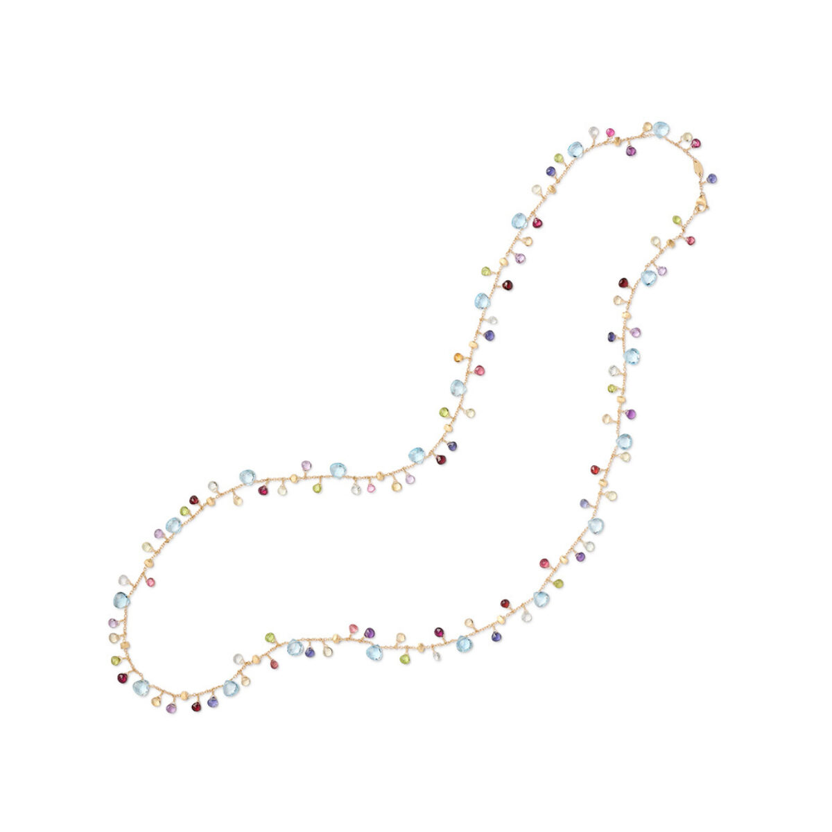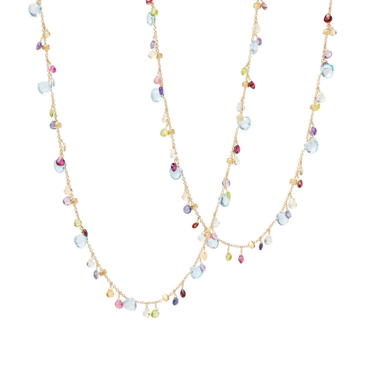 From the Marco Bicego Paradise collection, this blue sky Topaz 36” long strand necklace features a shimmery mix of natural gemstones joined by delicate gold chains and hand-engraved golden beads. Finely engraved by hand with the ancient millerighe burin technique. Perfect worn in its length or doubled.