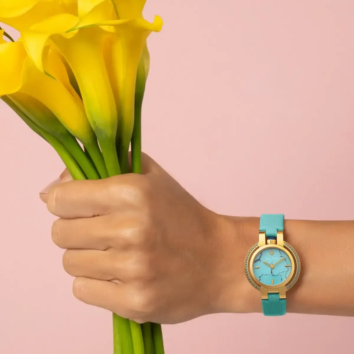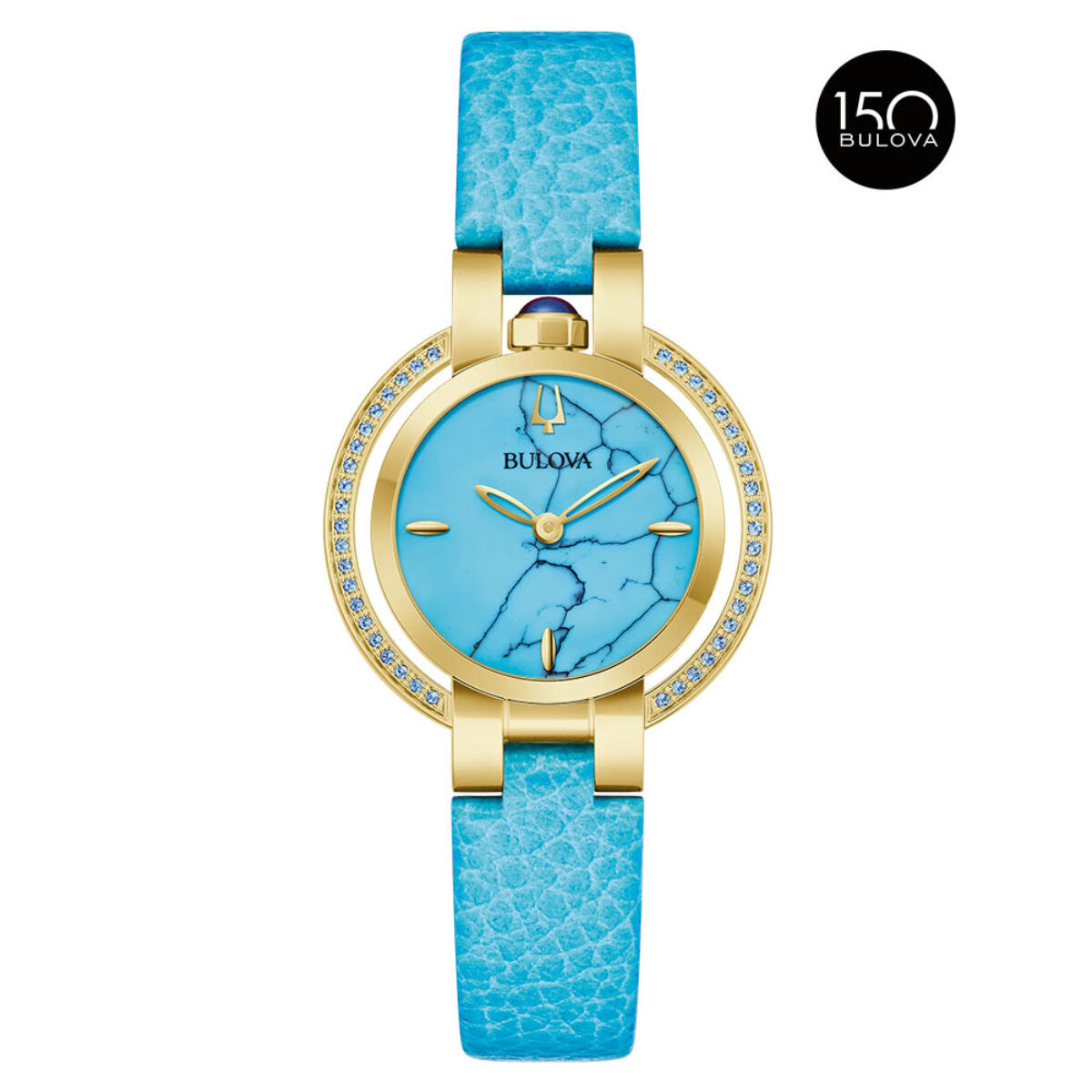 The Rubaiyat “Summer” dazzles with 42 blue topaz gemstones, totaling .25 ctw, encircling its elegant gold-tone stainless steel 30mm halo case which is finished with a synthetic spinel cabochon crown . The striking dial, finished with a double-curved sapphire crystal, is carefully crafted from reconstituted turquoise, evoking crystalline tropical waters, with black striations ensuring each dial is unique. Accented with surfboard-shaped markers and paired with a matching calf grain leather strap with a custom fold-over clasp with two pushers, this luxurious women’s timepiece is a timeless addition to any collection and comes with special Rubaiyat packaging, complete with a storybook.