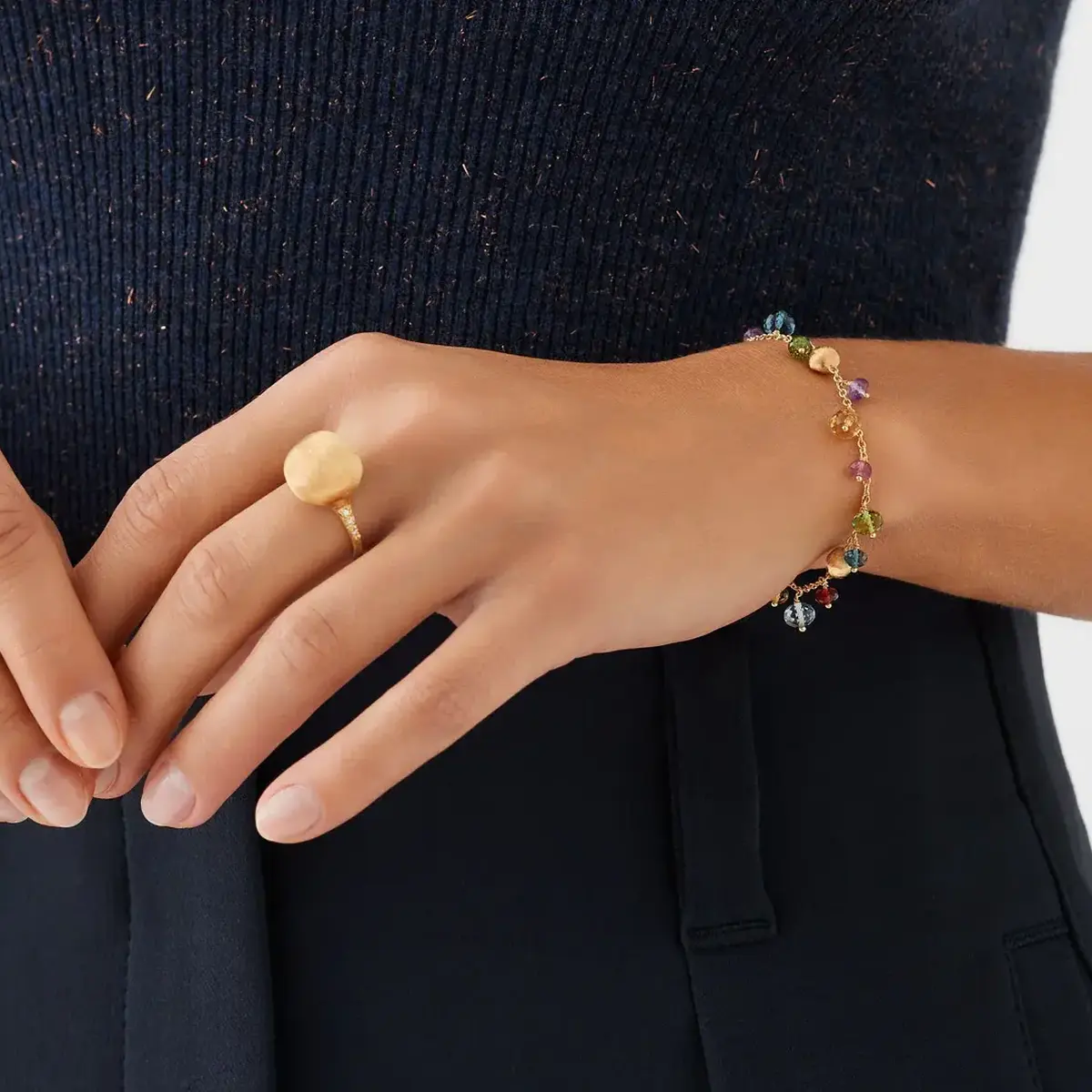 Part of the Africa Collection by Marco Bicego, this playful bracelet is composed of a magnificent mix of colored gemstones and irregular 18K yellow gold beads, finely hand engraved with the ancient Florentine technique. Fun and lively, this bracelet adds a touch of color to any outfit. Length: 6" to 7.25"