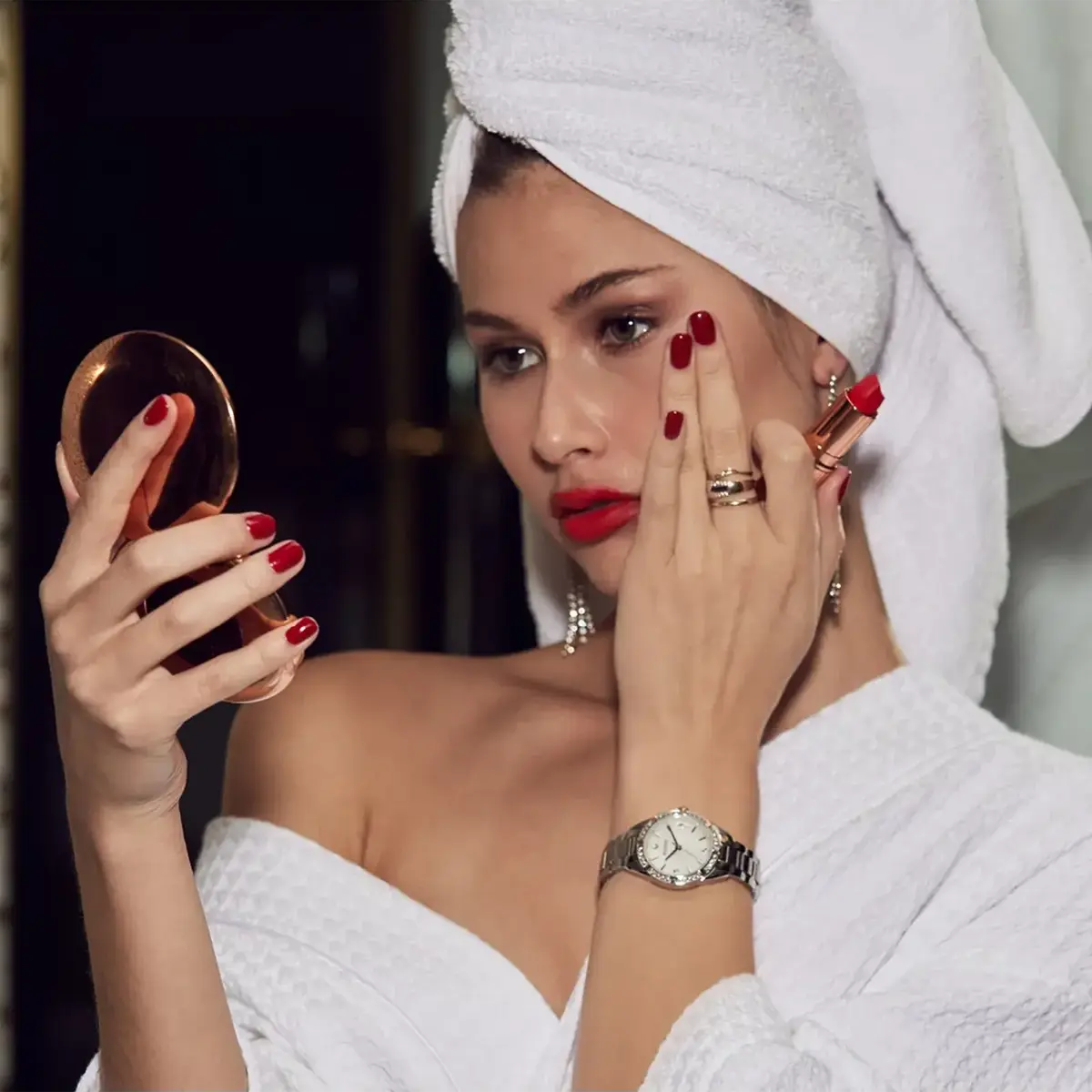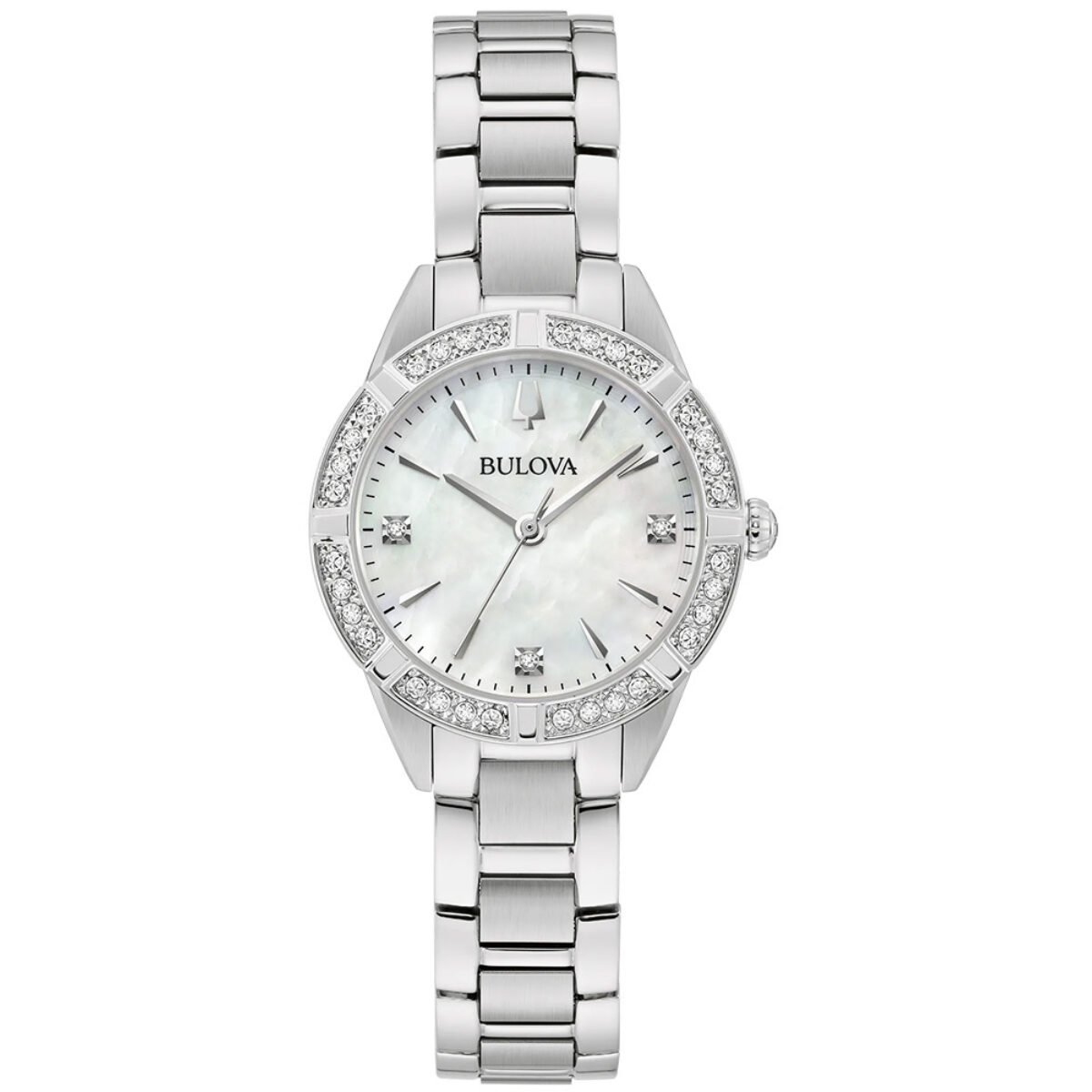 This beautiful addition to the Bulova Ladies’ Sutton collection offers a sophisticated timepiece for every occasion. The slender silver-tone stainless steel case is set with 16 dazzling diamonds and features a domed sapphire crystal for exceptional clarity. The lustrous genuine mother-of-pearl dial is accented with 3 diamonds and silver-tone hands and hour markers. Completing the timepiece is a matching silver-tone bracelet with a push-button deployant clasp. For the refined woman, the Bulova Ladies’ Sutton provides a timepiece that doesn’t compromise.