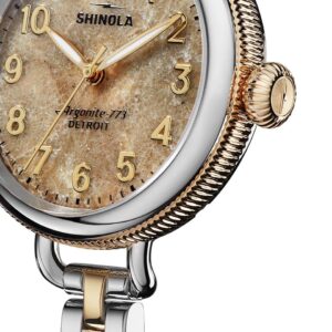 This fun and sophisticated classic watch features all the signature Birdy details—playful proportions, a coin edge and wire lugs—but pays homage to Michigan roots with its Petoskey stone dial. Sought-after by locals and visitors alike, this stone is the fossil of colonial coral that lived more than 350 million years ago—and it can only be found on the shores of northern Michigan beaches. The warm two-tone gold and stainless steel case and bracelet complete the look of this iconic Detroit-assembled watch. Note: Petoskey stone can vary in pattern and color. No two are the same.