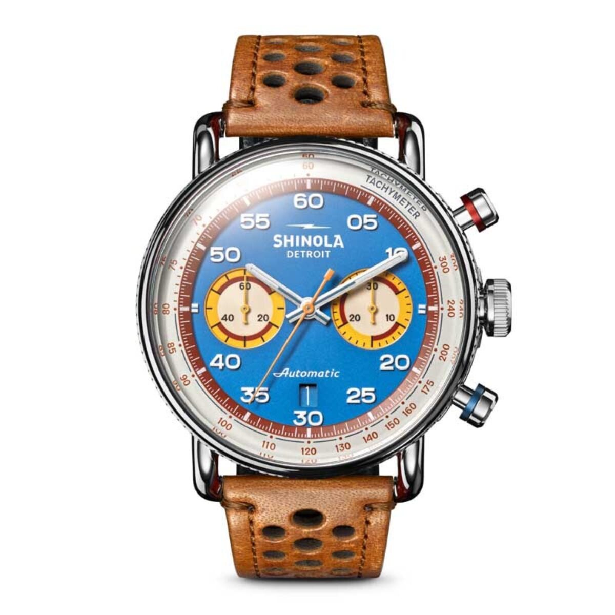 The 44mm Automatic Chronograph is inspired by master mechanics that push performance to the redline. This limited-edition automatic chronograph features a tachymeter bezel—a scale that converts time elapsed into speed travelled. Crafted in polished stainless steel, the case features a bold coin-edge bezel and vibrant anodized aluminum collars on the pushbuttons, adding a dynamic touch. Through the full exhibition caseback, the customized Sellita movement reveals itself in all its precision. The matte velvet horizon blue dial is accented by two sub dials, inspired by two-tone wheel designs. Like finely tailored racing gloves, the “Big Rally” perforated honey brown leather strap offers the perfect finishing touch. Limited to just 500 pieces, the Lap 07 arrives in packaging inspired by vintage performance cars, accompanied by a custom-designed poster.