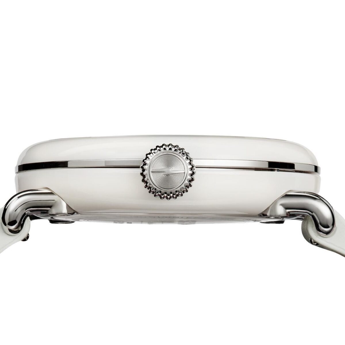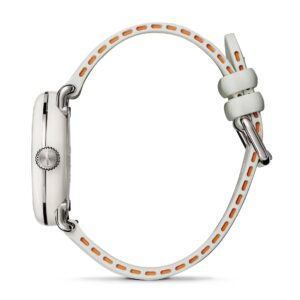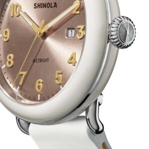 At 41mm, this piece pops on any and every wrist. Gold hands and numbers stand out against the sunray nude dial. A stainless steel core gives the watch its strength, and it’s co-molded with polished cream TR90 resin for durability and moisture-resistance. The piece is brought together with an ultra-comfortable FKM rubber strap in cream, with a classic pop of Shinola orange along the edges. Wear anywhere and everywhere—and every way but out.