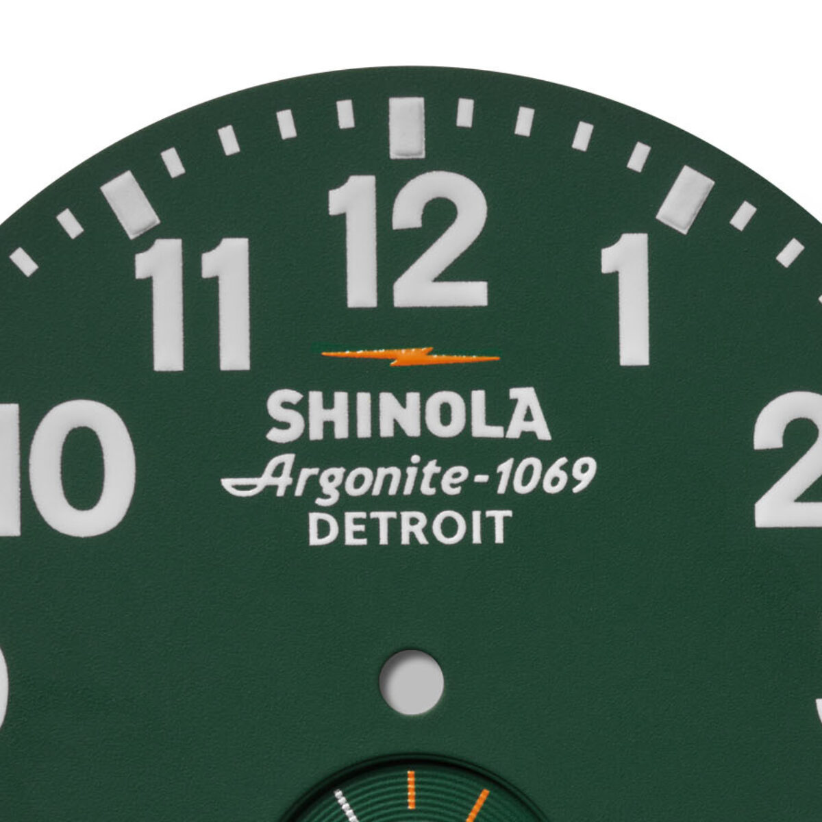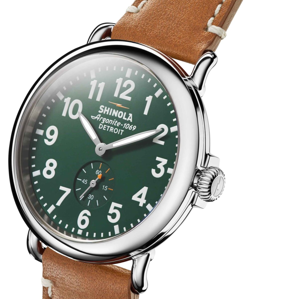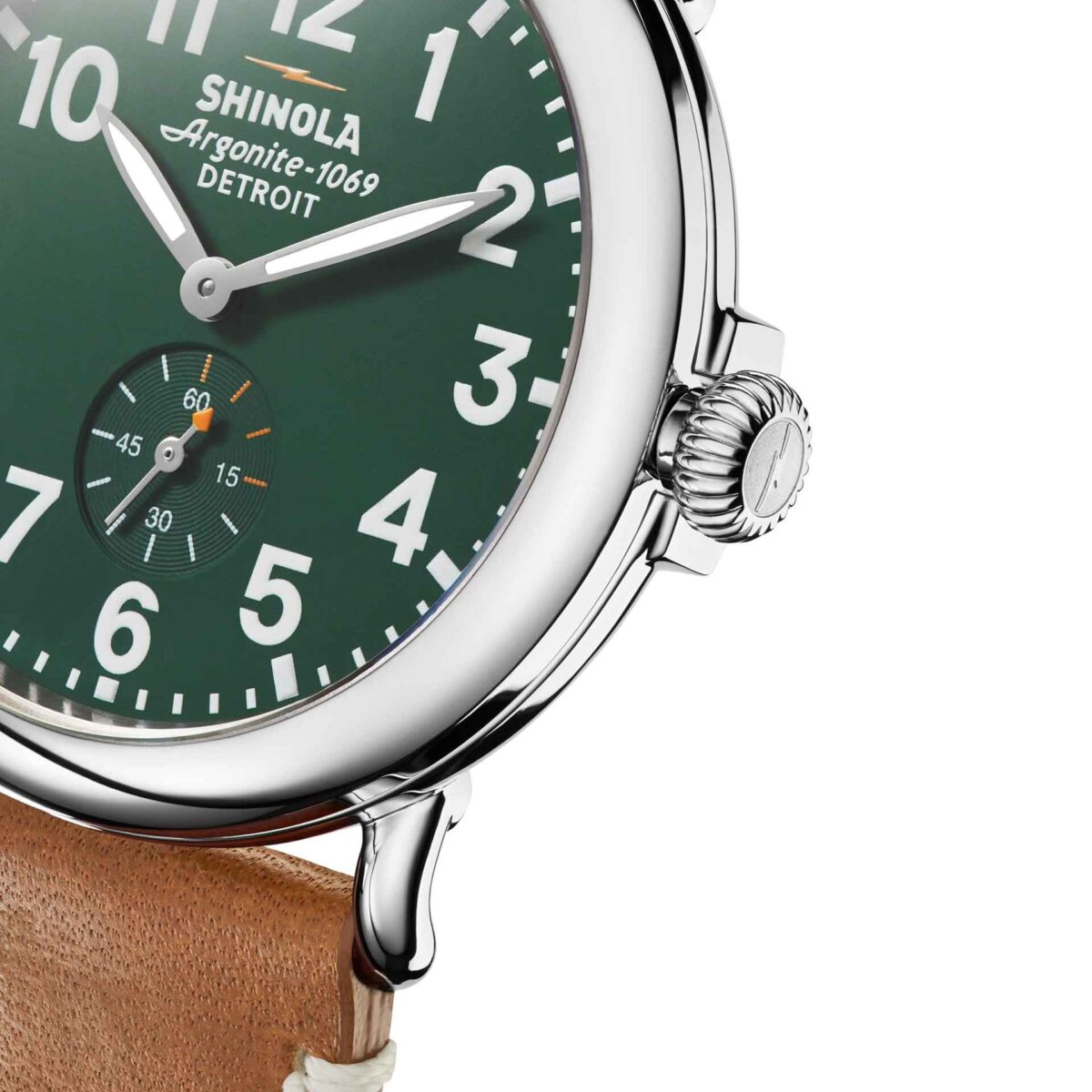 This 41mm Runwell features a rich green dial set in a solid stainless steel case finished with a classic pumpkin crown. The double-domed sapphire crystal protects the watch from scratches through years of wear. The leather strap in maple will develop a unique patina over time to give your timepiece a one-of-a-kind look.