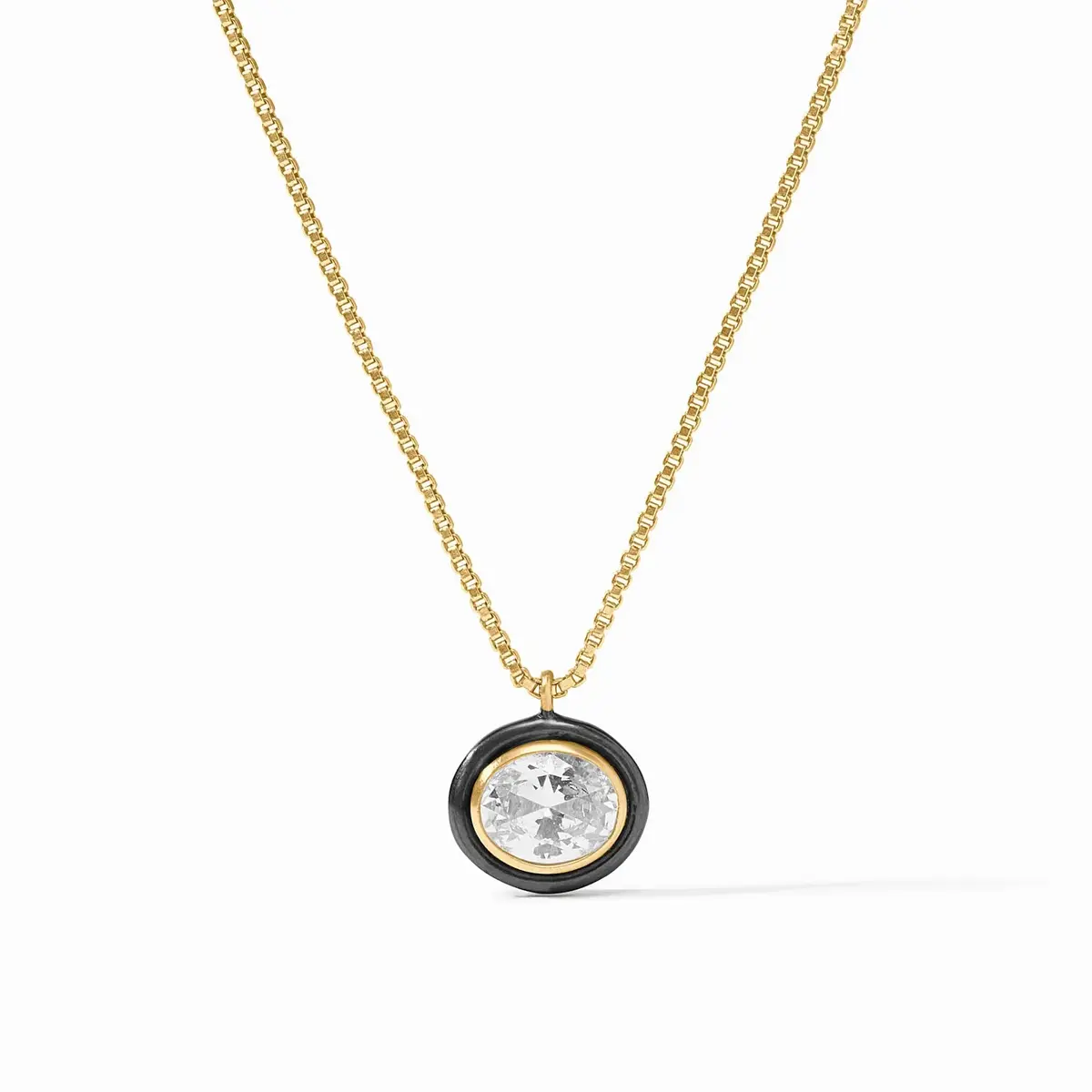 A modern classic with a subtle edge. This delicate necklace features a brilliant, faceted cubic zirconia framed in Julie Vos’s signature 24K gold plate and accented by a sleek black enamel-style border for a striking contrast. Product Details: 24K gold plate, CZ. Length: 16.5 / 17.5 inches (adjustable). Pendant measures 0.7 inches. Closes with lobster clasp.
