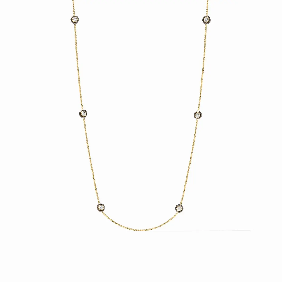 Product Details: 24K gold plate, CZ. Length: 38 inches or 19 inches doubled. Closes with toggle.