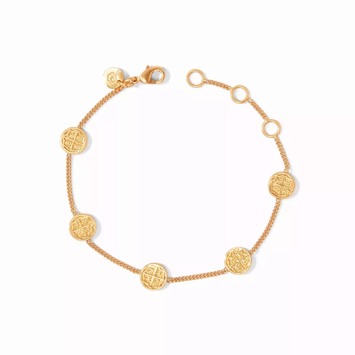 Five petite gold coin stations on a delicate chain. Adjustable length 6 - 6.5 - 7 inches